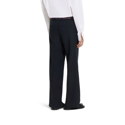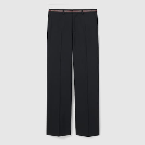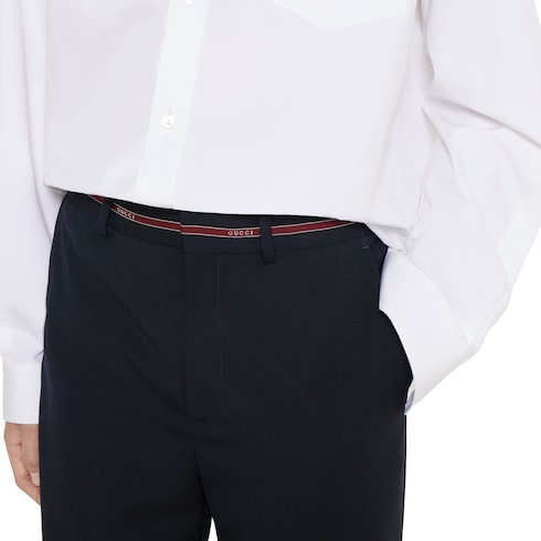 I capi per tutti i giorni sono impreziositi dal dettaglio Gucci cimosa o dalla stampa logo vintage Gucci, che conferiscono un tocco urbano. Questo paio di pantaloni in lana blu scuro è impreziosito da un dettaglio Gucci cimosa in vita.