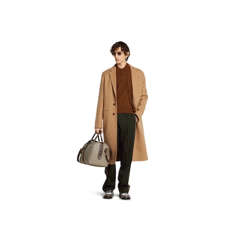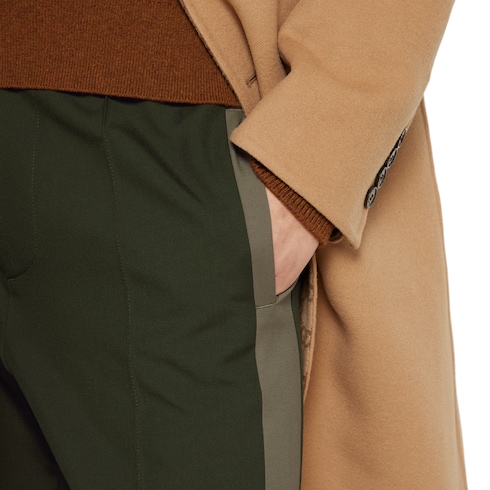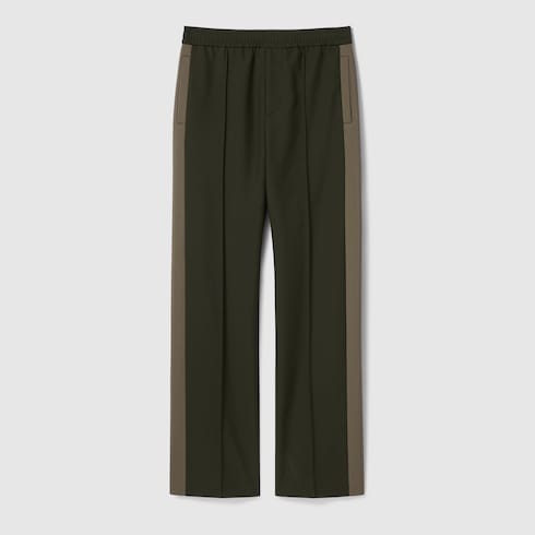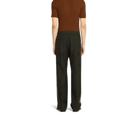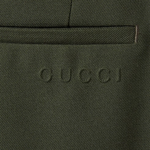 I capi della collezione Pre-Fall 2025 proposti in nuance tenui di nero, grigio e verde mettono in risalto delicati ricami floreali, loghi in rilievo e altri dettagli di fattura artigianale. Realizzati in twill di lana verde bosco, questi pantaloni sono definiti dal logo Gucci in rilievo sulla parte posteriore e presentano bande a contrasto sul fianco.