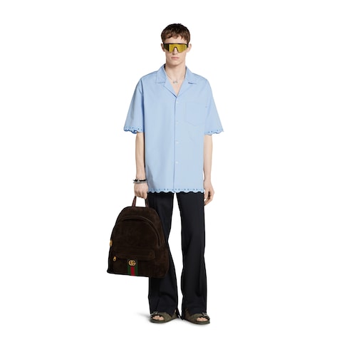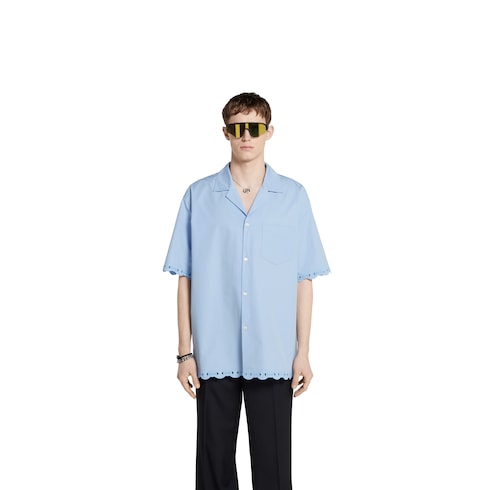 La collezione Pre-Fall 2025 impreziosisce il guardaroba di tutti i giorni con un mix di texture, motivi e colori. Qui il ricamo Gucci Marina Chain caratterizza e decora una camicia in popeline di cotone, reinterpretando i capi estivi in una nuova chiave.