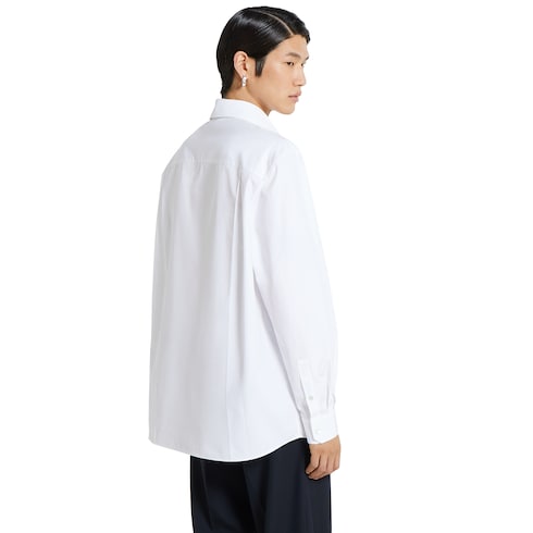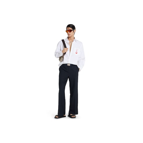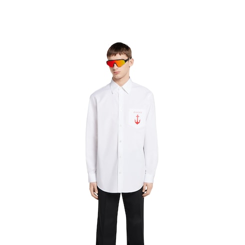 Righe alla marinara, il motivo àncora e il logo della Maison arricchiscono le silhouette casual della collezione Pre-Fall 2025, perfette da indossare in riva al mare. Questa camicia è realizzata in popeline di cotone bianco e impreziosita da un ricamo ancora Gucci.