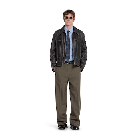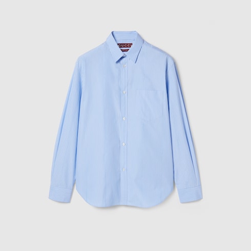 Per la collezione Pre-Fall 2025, un approccio all'abbigliamento formale ispirato alle influenze per il tempo libero e il leisurewear introduce nuovi tagli e nuove silhouette, combinando elementi caratteristici con dettagli raffinati. Realizzata in popeline di cotone a righe celeste, questa camicia è arricchita dal logo Gucci in fil coupé.