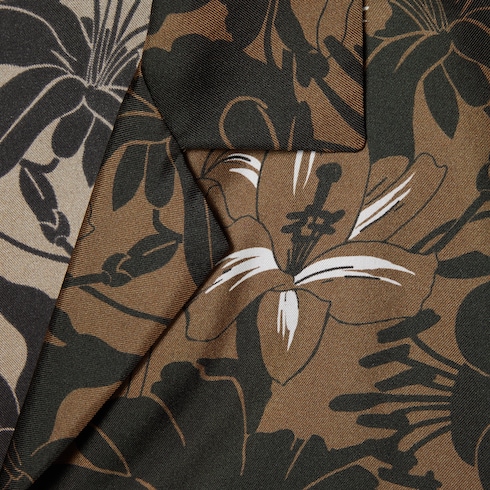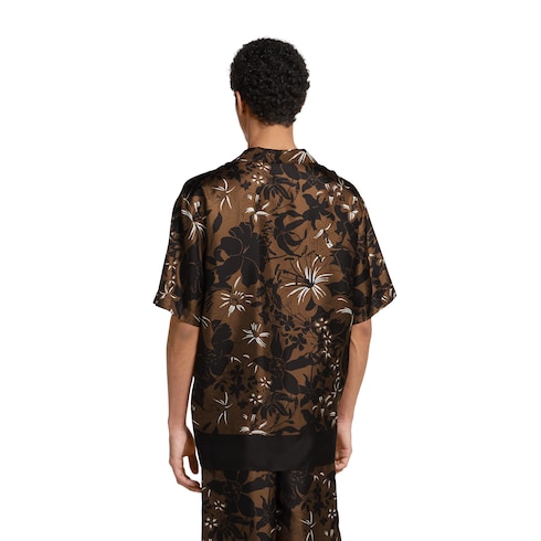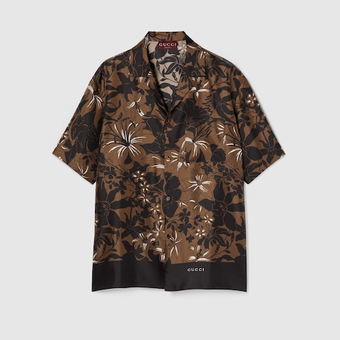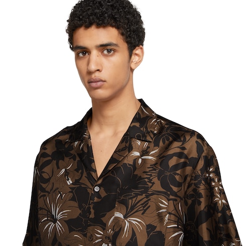 Una selezione di capi ready-to-wear della collezione Pre-Fall 2025 è caratterizzata da uno spirito bohémien, con stampe colorate e silhouette rilassate. Realizzata in twill di seta marrone scuro e cammello, questa camicia bowling sfoggia una stampa floreale all over combinata con il logo Gucci.