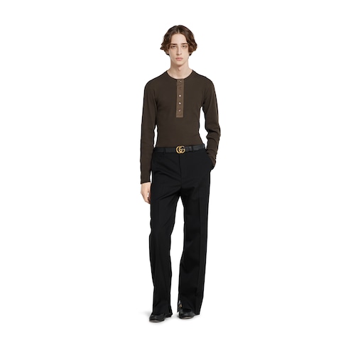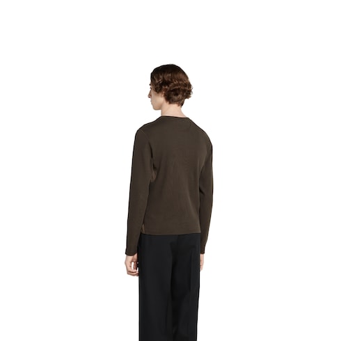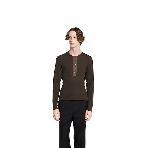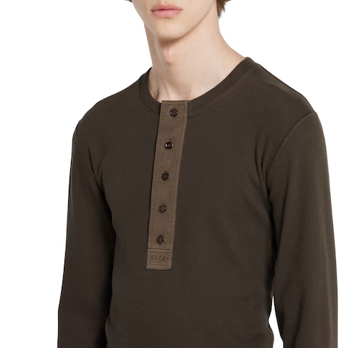 I capi della collezione Pre-Fall 2025 mettono in risalto delicati ricami floreali, loghi in rilievo e altri dettagli di fattura artigianale. Realizzata in cotone pesante a coste in colore marrone scuro, questa T-shirt a maniche lunghe è definita da un ricamo Gucci, per un tocco sofisticato.