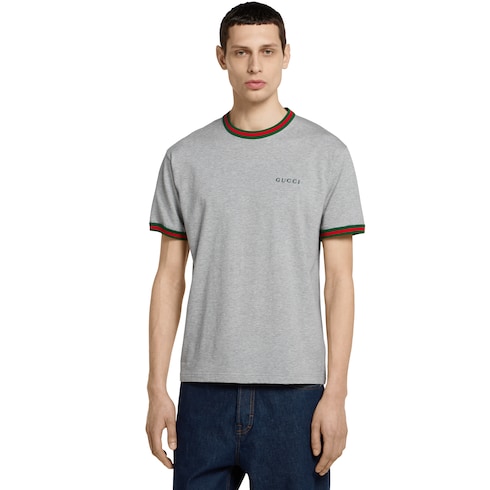 Alcuni dettagli storici della Maison impreziosiscono una selezione di capi ready-to-wear. Questa T-shirt in jersey di cotone grigio mélange presenta esclusive finiture con motivo Web ed è completata da un dettaglio con logo ricamato.
