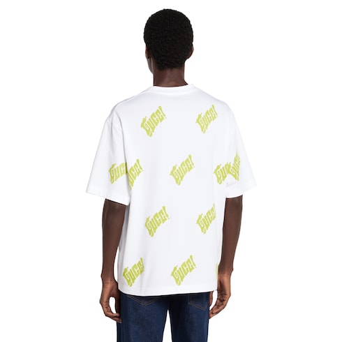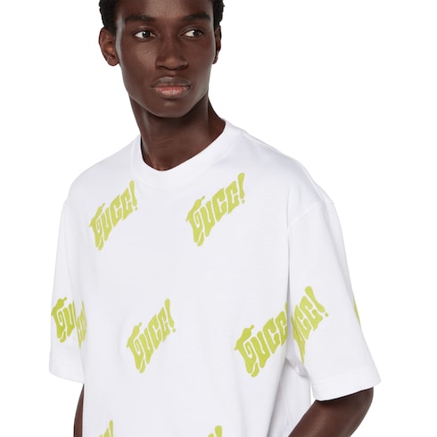 Per la collezione Pre-Fall 2025, l'artista cinese Currynew (Xiang Zhang) reinterpreta il logo della Maison su capi ready-to-wear uomo, accessori e articoli di piccola pelletteria proponendone una versione insolita. Realizzata in jersey di cotone pesante bianco, questa T-shirt sfoggia un ricamo Gucci all-over declinato nella tonalità verde lime.