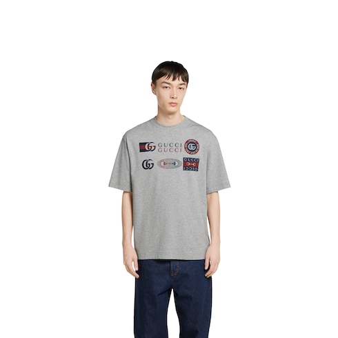Alcuni dettagli storici della Maison impreziosiscono una selezione di capi ready-to-wear. Questa T-shirt dal taglio oversize, realizzata in jersey di cotone grigio chiaro, è definita da una stampa simboli Gucci abbinata a un discreto logo ricamato a completare il look.