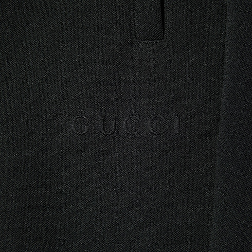 La collezione Pre-Fall 2025 mette in risalto silhouette essenziali con dettagli emblematici, dall'abbigliamento da giorno a quello da sera. Questi comodi pantaloni sportivi dal taglio rilassato, realizzati in jersey tecnico nero, sono definiti dal logo Gucci in rilievo.