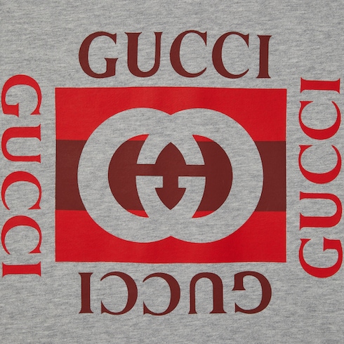 I codici emblematici della Maison continuano a evolversi per la nuova stagione e sono proposti in nuove declinazioni sui capi in jersey. Questa felpa, realizzata in jersey di cotone grigio mélange, è definita dalla stampa Gucci Incrocio GG a righe.