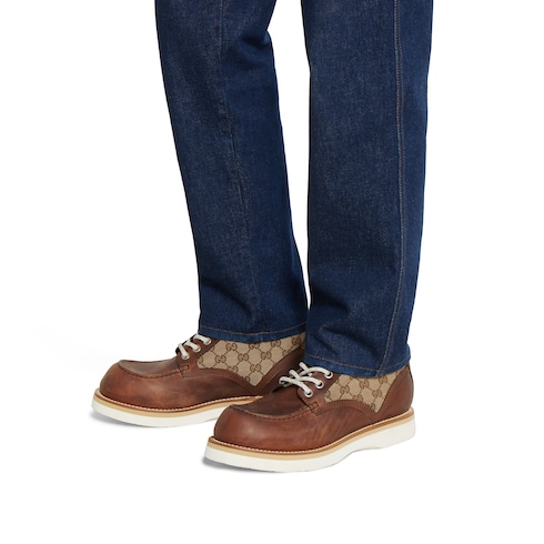 Combinando una silhouette classica con gli elementi distintivi di Gucci, questo stivaletto stringato da uomo presenta un inserto in tessuto GG in omaggio alla tradizione della Maison. Realizzato con una costruzione Goodyear, che garantisce una struttura resistente e migliora la durata della calzatura, questo modello coniuga tradizione e innovazione.
