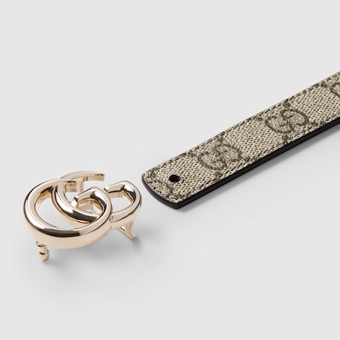 Per la collezione Autunno Inverno 2025, l'inconfondibile linea GG Marmont è proposta in nuove versioni e declinazioni inedite. Questa sottile cintura reversibile è realizzata in GG Supreme con rovescio in pelle ed è definita da una fibbia con Doppia G.