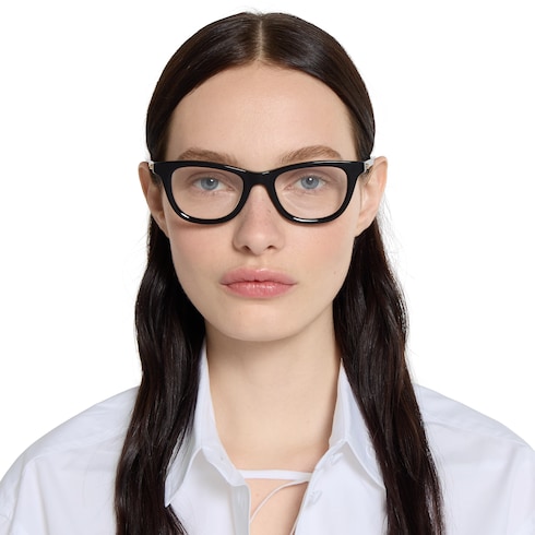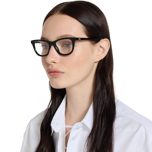La collezione di occhiali Pre-Fall 2025 combina le silhouette ricercate dei decenni passati aggiungendo il logo per un tocco contemporaneo. Qui, la montatura in acetato nero è completata dal dettaglio Incrocio GG e dal logo Gucci inciso.