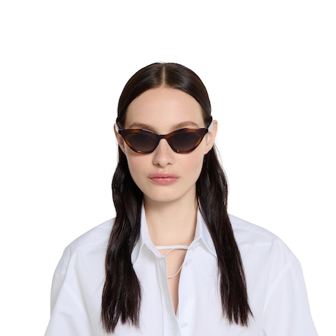 La collezione di occhiali Pre-Fall 2025 reinterpreta con un tocco contemporaneo silhouette d'archivio dal design di grande impatto. Questo paio di occhiali da sole cat-eye, con lenti grigio chiaro sfumato, è caratterizzato dal dettaglio logo Gucci a contrasto sulle aste.