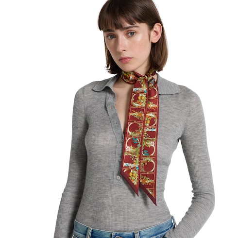 Nella collezione Pre-Fall 2025, gli accessori in seta aggiungono un tocco di vivacità ai codici della Maison attraverso finiture raffinate, patch con logo e ricami delicati. Questo versatile nastro in twill di seta è definito da una splendida stampa floreale Gucci GG all over.