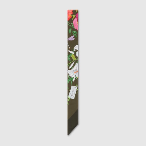 Nella collezione Primavera Estate 2025, gli accessori in seta sono proposti in colori vivaci, come questo nastro con motivo Gucci Flora.
