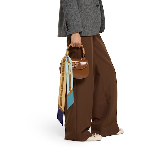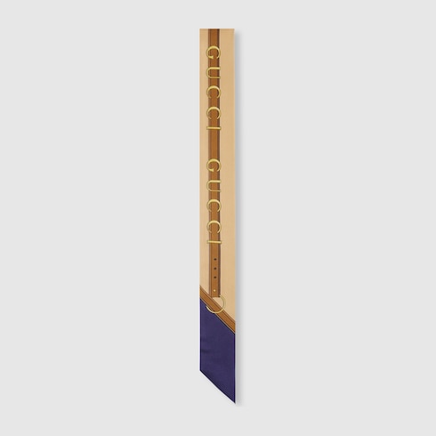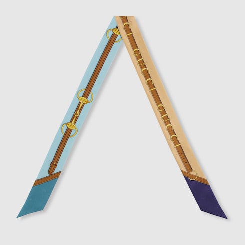 La collezione Autunno Inverno 2025 rende omaggio alle radici equestri della Maison con questo nastro in seta caratterizzato da una stampa cinture Gucci e Morsetti all over.