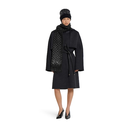 Nella collezione Cruise 2026, gli accessori tessili donna fondono ispirazione rétro, attraverso elementi d'archivio, con l'opulenza degli anni '90. Questa sciarpa è realizzata in lana GG con cristalli e impreziosita da finiture con frange.
