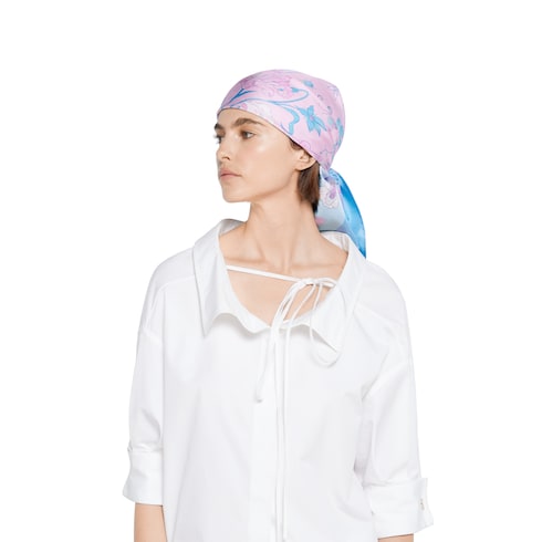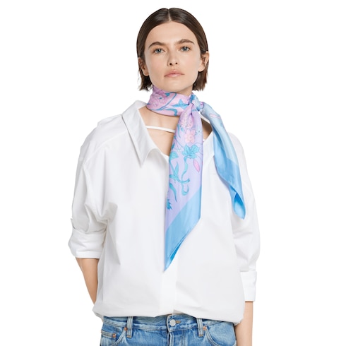 Caratterizzato da un disegno dell'illustratrice e disegnatrice Yu Cai, che nei suoi lavori unisce tecniche tradizionali e innovazioni digitali per indagare l'esistenza urbana, questo carré reinterpreta il motivo Flora della Maison Gucci nell'ambito del progetto 90 x 90.