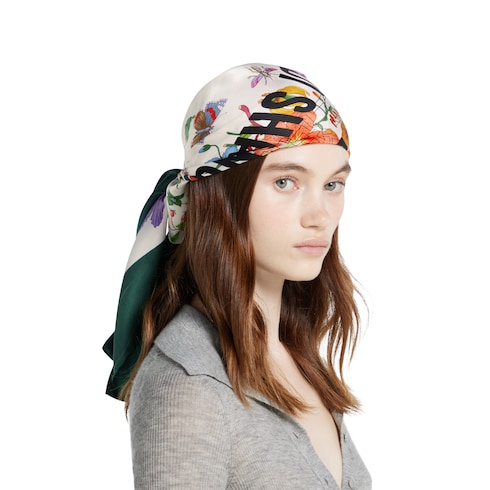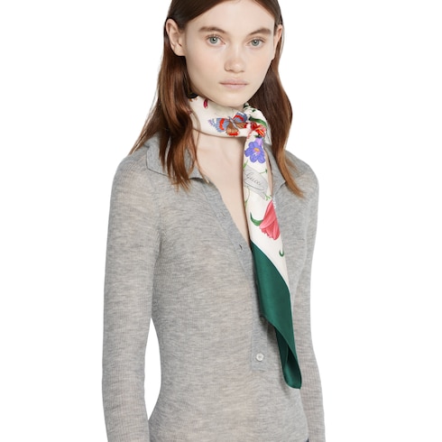Caratterizzato da un disegno dell'artista Sara Leghissa, le cui opere indagano e approfondiscono il rapporto con la realtà, questo carré esplora il motivo Flora della Maison Gucci nell'ambito del progetto 90 x 90.