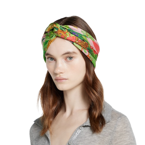 Caratterizzato da un disegno dell'artista Inji Seo, i cui lavori esplorano l'intersezione tra arte e cultura pop attraverso la tecnica dell'animazione e dell'illustrazione, questo carré reinterpreta il motivo naturalistico della Maison Gucci nell'ambito del progetto 90 x 90.