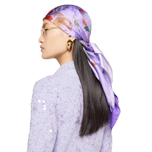 Nella collezione Pre-Fall 2025, gli accessori tessili aggiungono un tocco di vivacità ai codici della Maison attraverso finiture raffinate, patch con logo e ricami delicati. Questo carré in twill di seta reinterpreta il motivo Flora di Gucci in nuove tonalità.