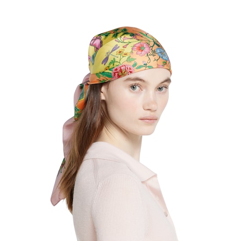 Per la collezione Cruise 2025, i simboli e i codici distintivi della Maison sono reinventati in chiave moderna. Questo carré in seta presenta una colorata stampa equestre floreale, che reinterpreta la tradizione Gucci in chiave nuova.