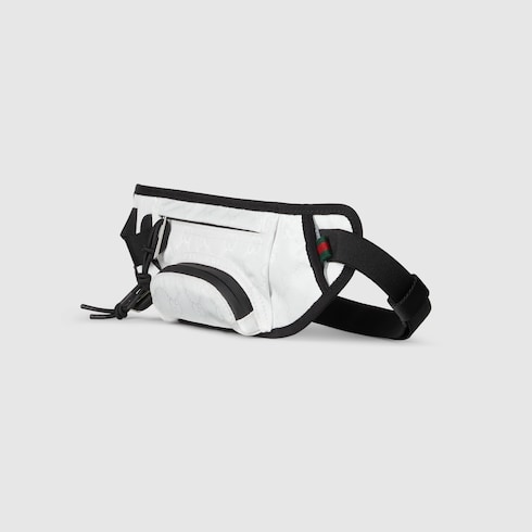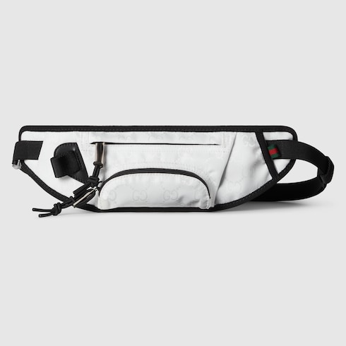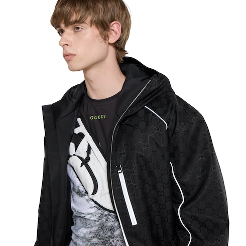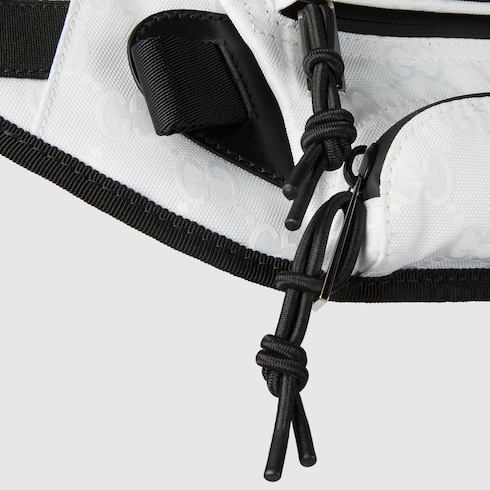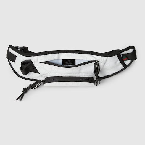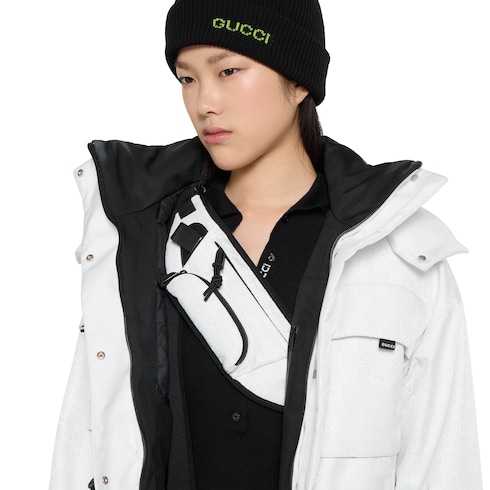 Gucci Altitude, la prima collezione di abbigliamento sportivo invernale della Maison, combina prestazioni elevate e codici distintivi. Realizzato in nylon GG jacquard, questo marsupio è arricchito da finiture nere e da un'etichetta motivo Web verde e rosso.