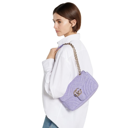 La collezione di borse GG Marmont, tra le più emblematiche della Maison, è caratterizzata dal dettaglio Doppia G in metallo, dalla tracolla a catena sfaccettata e dalla costruzione morbida in materiali pregiati. Questo modello è realizzato in denim matelassé con motivo chevron in una tonalità delicata, perfetta per la stagione.