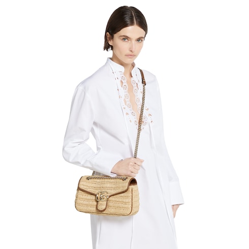 Realizzata in viscosa effetto rafia, la borsa a spalla GG Marmont misura media richiama lo stile delle giornate più calde grazie alla sua texture naturale. Le finiture in pelle liscia e l'esclusiva Doppia G completano il design, unendo ispirazione stagionale e dettagli della Maison senza tempo.