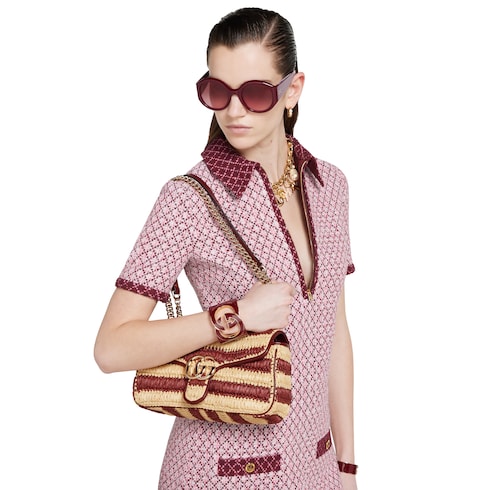 Le borse sono arricchite da dettagli esclusivi in rafia, come strisce colorate e finiture in pelle liscia, che richiamano lo stile invernale. Questa borsa a spalla GG Marmont è realizzata in viscosa effetto rafia a righe Gucci Rosso Ancora e naturali ed è completata dall'esclusivo dettaglio Doppia G della linea.