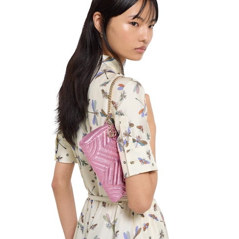 La collezione di borse GG Marmont, tra le più emblematiche della Maison, è caratterizzata dalla Doppia G, dalla tracolla a catena sfaccettata e, in questa versione della borsa a spalla, dalla costruzione morbida in pelle lamé.