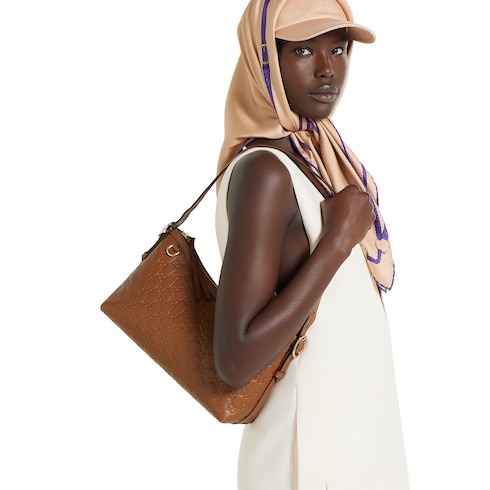 La collezione GG Emblem reinterpreta l'eleganza e la maestria artigianale che hanno caratterizzato la storia della Maison. Questa borsa a spalla è realizzata in pelle con GG in rilievo.