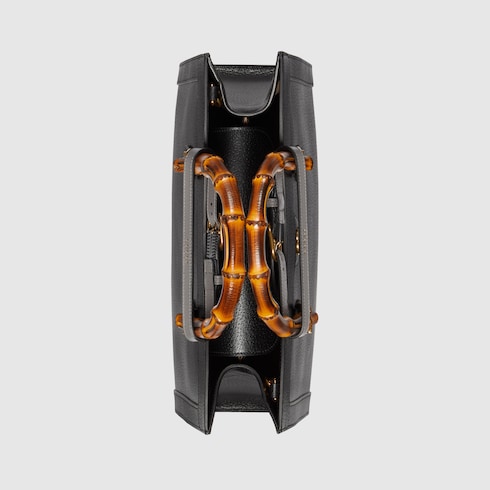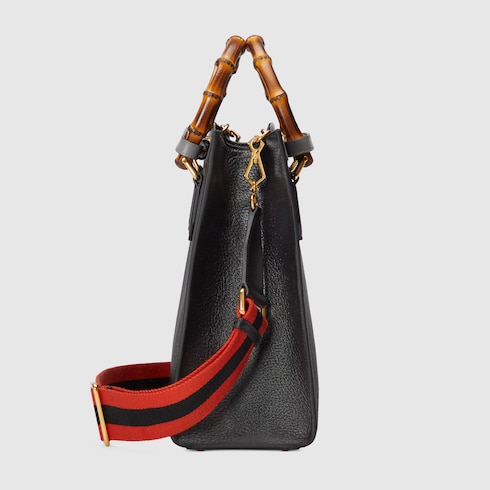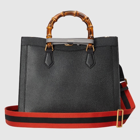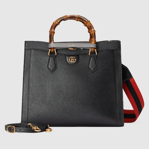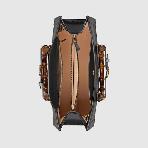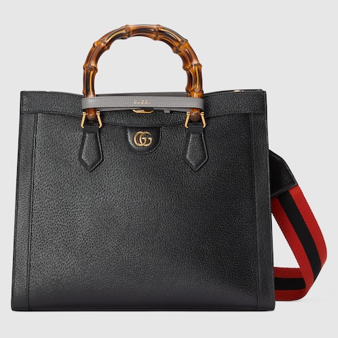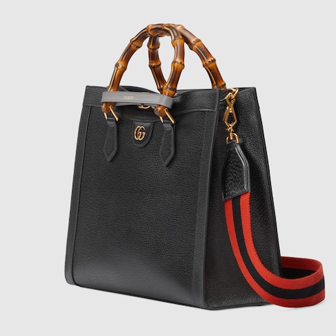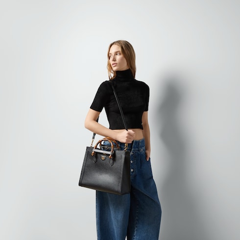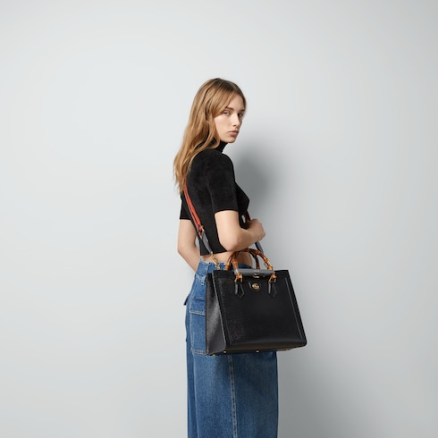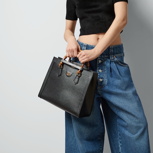 Utilizzato per la prima volta nel dopoguerra, quando non era facile reperire materiali tradizionali, il bambù è diventato non solo il simbolo dello spirito di reinvenzione del marchio ma anche uno dei codici stilistici più riconoscibili della Maison. La borsa Gucci Diana incarna l'idea di uno stile in continua evoluzione ed è caratterizzata dalle fasce rimovibili in pelle, che ricordano le fasce funzionali a mantenere la forma del manico. Qui, la borsa è realizzata in pelle nera.