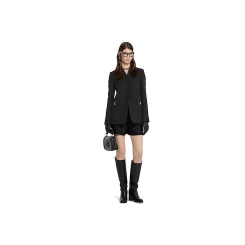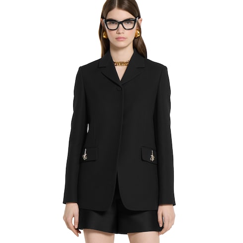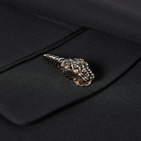 Realizzata in una palette monocromatica impreziosita da dettagli discreti, come ricami raffinati o il logo in metallo, una selezione di capi della collezione Pre-Fall 2025 rappresenta la scelta perfetta per ogni ora del giorno. Questa giacca in crêpe cady di lana e seta è arricchita dal dettaglio testa di tigre, un simbolo storico della Maison che decora e impreziosisce le tasche frontali.