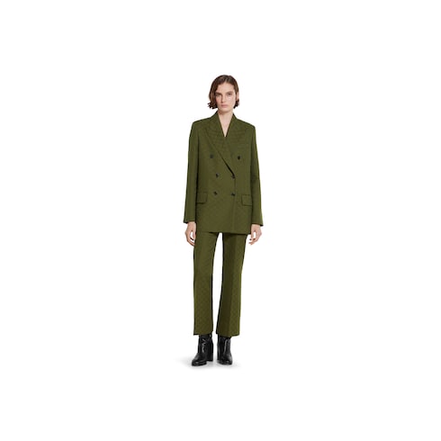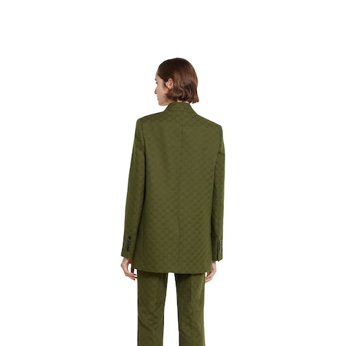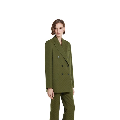 Il verde caratterizza la palette cromatica della collezione Pre-Fall 2025 giocando con texture, dettagli con logo e diverse nuance di colore, come nei look visti in passerella. Questa giacca doppiopetto, proposta nell'esclusiva tonalità, sfoggia un motivo GG all over.