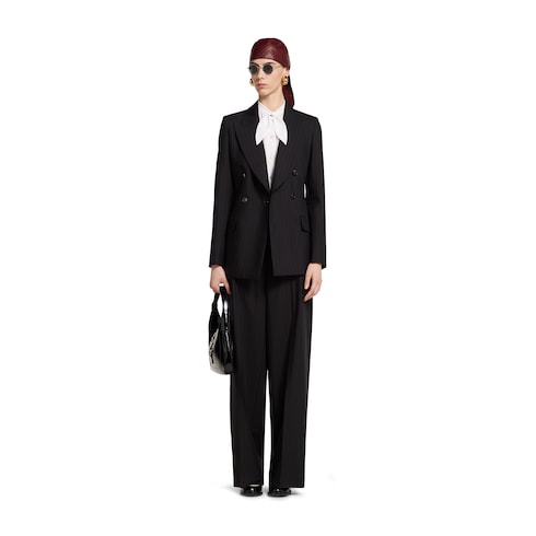 Le silhouette sartoriali rimandano alla raffinata maestria artigianale e ai materiali sofisticati che definiscono le ultime novità ready-to-wear di Gucci. Parte della collezione Pre-Fall 2025, questa giacca dalla classica costruzione doppiopetto è realizzata nell'esclusiva lana gessata Gucci jacquard.