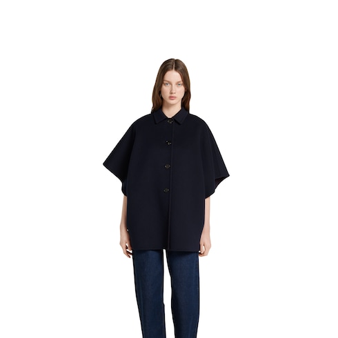 La collezione Pre-Fall 2025 presenta una nuova interpretazione dei materiali caldi su capispalla e modelli outerwear sofisticati, proposti con silhouette classiche e contemporanee. Questo cappotto reversibile, caratterizzato da maniche corte e ampie, è realizzato in tessuto di lana e seta blu semplice su un lato e in lana e seta blu e rosso con motivo GG sull'altro.
