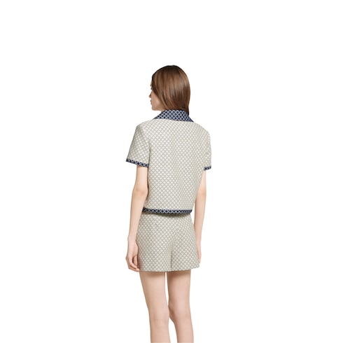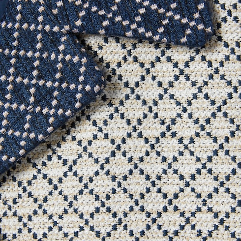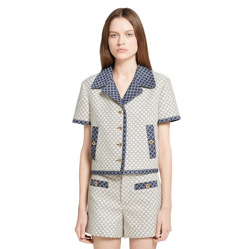 Cappotti, giacche e abiti uniscono eleganza discreta a dettagli raffinati nella collezione Pre-Fall 2025. Realizzata in cotone bouclé con motivo a rombi, questa giacca dal look bon ton presenta raffinati bottoni Gucci con àncora.