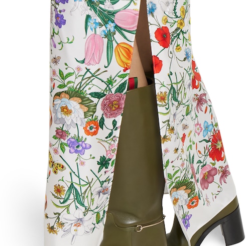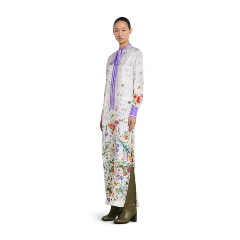 La stampa Flora d'archivio degli anni '60 prende vita su capi ready-to-wear, che esplorano le nuove tonalità e sfumature della collezione Pre-Fall 2025 in chiave romantica. Qui definisce un abito lungo in cotone arricchito da un fiocco annodabile al collo.