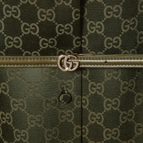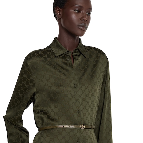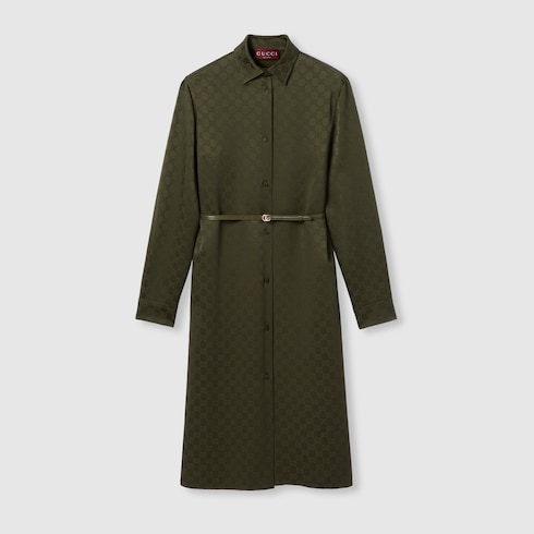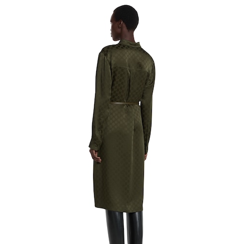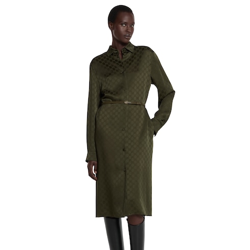 Il verde caratterizza la palette cromatica della collezione Pre-Fall 2025 giocando con texture, dettagli con logo e diverse nuance di colore, come nei look visti in passerella. Questo abito chemisier è proposto in raso GG nell'esclusiva tonalità e completato da una cintura con Doppia G.