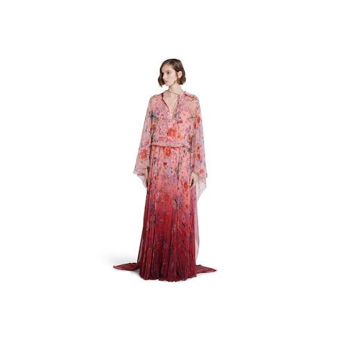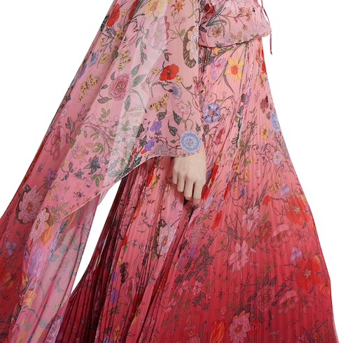 La stampa Flora d'archivio degli anni '60 prende vita su capi ready-to-wear, che esplorano le nuove tonalità e sfumature della collezione Pre-Fall 2025 in chiave romantica. Su questo abito lungo a pieghe, realizzato in georgette di poliestere, la storica stampa si intensifica sempre più man mano che si scende verso l'orlo.