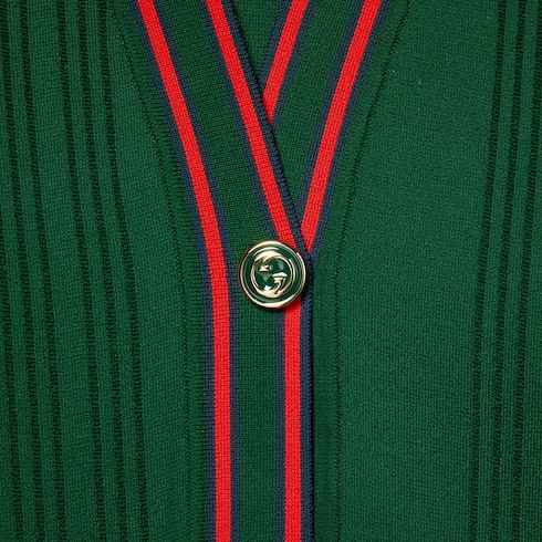 La Maison continua a esplorare il legame con il mondo del tennis, iniziato negli anni '70. Articoli esclusivi puntano su dettagli tradizionali, come il nastro Web, e su materiali innovativi. Questo cardigan in fine viscosa è caratterizzato da finiture a righe rosse a contrasto e un ricamo Gucci.