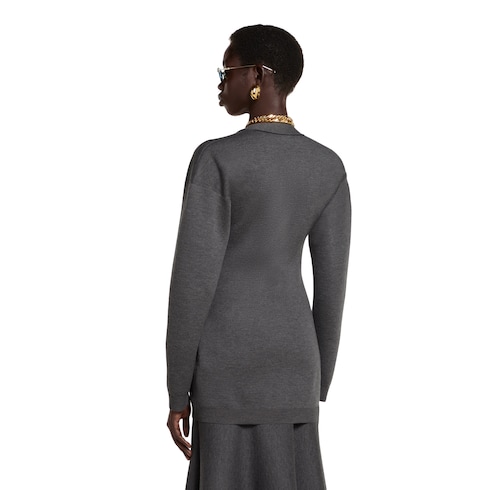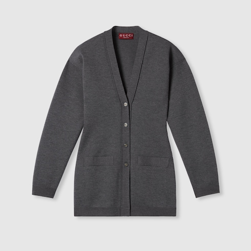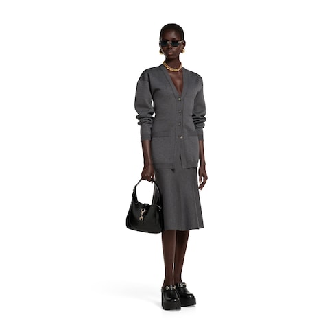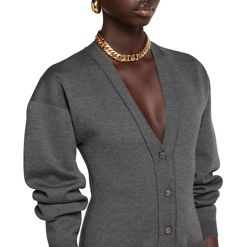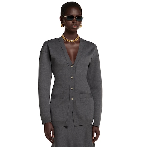 La collezione Pre-Fall 2025 presenta una nuova interpretazione dei materiali caldi su capi in maglia sofisticati, proposti con silhouette classiche e contemporanee. Questo cardigan, realizzato in lana ultrafine, è arricchito da bottoni con Doppia G in tonalità oro.
