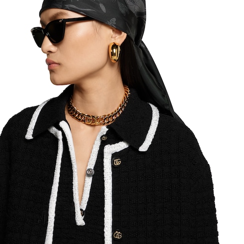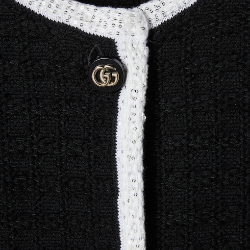 Cappotti, giacche e abiti uniscono eleganza discreta a dettagli raffinati nella collezione Pre-Fall 2025. Realizzato in morbido tweed di lana, questo cardigan dal look bon ton sfoggia finiture ricamate con paillette ed è impreziosito dai bottoni con Doppia G in tonalità oro.