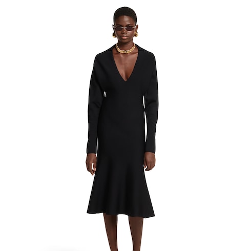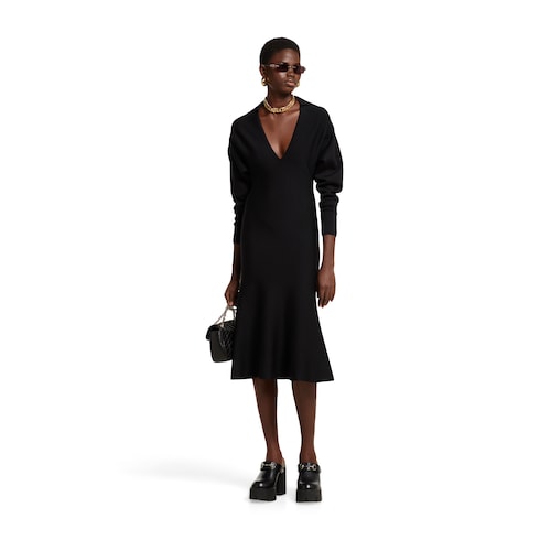 La collezione Pre-Fall 2025 presenta una nuova interpretazione dei materiali caldi su capi in maglia sofisticati, proposti con silhouette classiche e contemporanee. Questo abito aderente, realizzato in lana ultrafine, è arricchito da bottoni con Doppia G in tonalità oro.