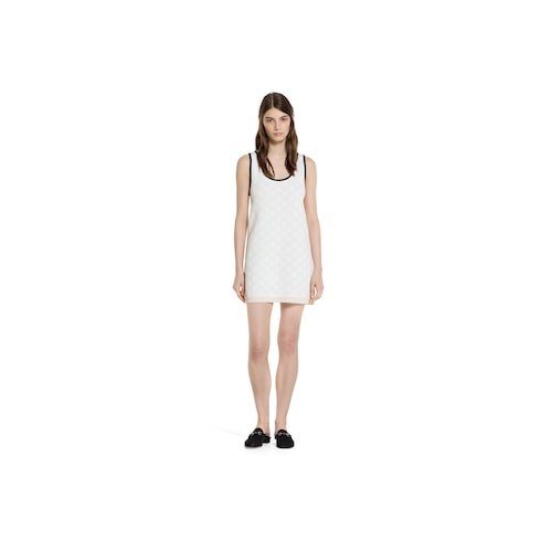 La collezione Pre-Fall 2025 combina alla perfezione texture versatili e dettagli sofisticati. Gli intrecci in GG jacquard e i dettagli complessi si evolvono per riflettere l'alternarsi delle stagioni. Il motivo GG all over impreziosisce questo abito, mentre le finiture blu navy a contrasto donano un tocco raffinato.
