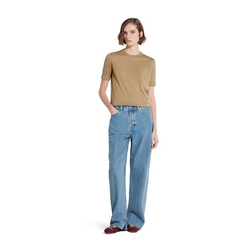 Nella collezione Pre-Fall 2025, il tema del lusso informale include raffinati capi in maglia, come questo top girocollo in misto seta e cashmere fine. Un delicato intarsio Gucci completa la silhouette.