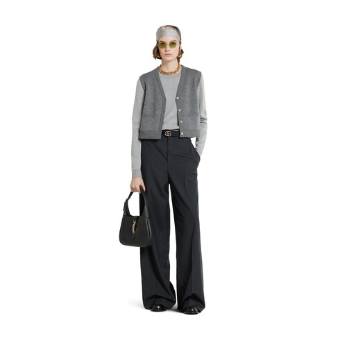 La collezione Pre-Fall 2025 presenta una nuova interpretazione dei materiali caldi su capi in maglia sofisticati, proposti con silhouette classiche e contemporanee. Questo modello particolare, realizzato in lana e seta, combina un top e un gilet in un gioco di sovrapposizioni. Completano il design le due tasche frontali e la fodera GG.