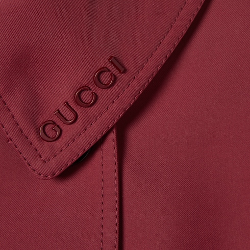 Per la collezione Pre-Fall 2025, i motivi emblematici della Maison campeggiano su texture raffinate, dal denim per gli outfit del tempo libero al nylon leggero, fino alla pregiata pelle scamosciata. Questo elegante trench è realizzato in gabardina di nylon con tessuto GG doppiato sul lato interno. Un discreto dettaglio Gucci in metallo completa il design.