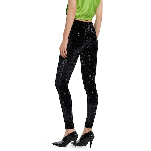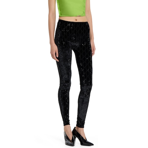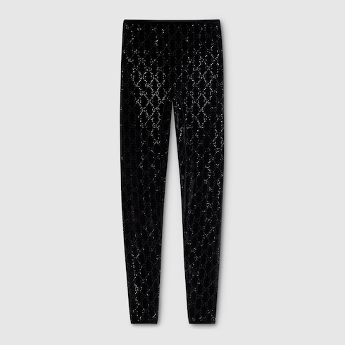 Nella collezione Autunno Inverno 2025, i leggings in ciniglia stretch vengono reinventati con un tocco luminoso. Questo modello è impreziosito da un ricamo GG con cristalli all over, per una rivisitazione in chiave contemporanea dei codici distintivi della Maison.