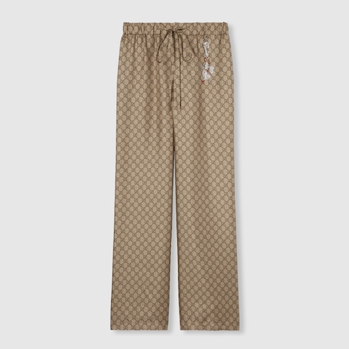 Nella collezione Pre-Fall 2025, i giocosi motivi dell'artista coreana Inji Seo decorano capi ready-to-wear donna e articoli di piccola pelletteria. Realizzati in twill di seta GG beige e marrone scuro, questi pantaloni presentano una stampa effetto trompe-l'oeil.